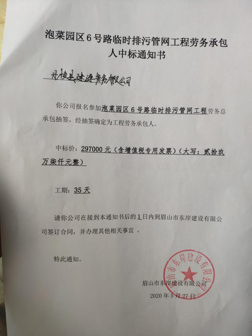 泡菜園區(qū)6號路臨時排污管網(wǎng)工程中標(biāo)通知